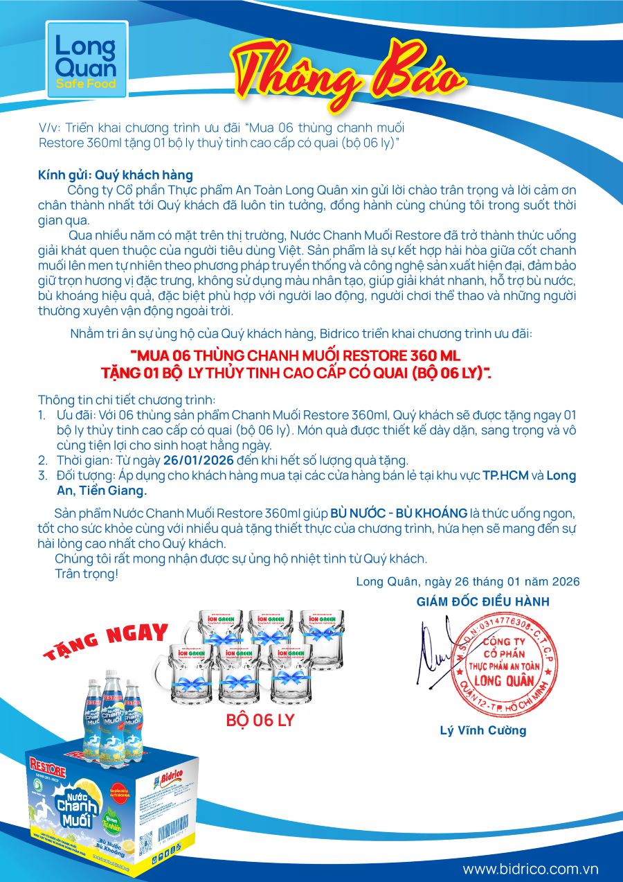 Ngày 31/03/2026, Công ty TNHH SX&TM Tân Quang Minh – Bidrico đã vinh dự được trao tặng chứng nhận Hàng Việt Nam Chất Lượng Cao (HVNCLC) 2026. Đây là minh chứng cho sự tin yêu của người tiêu dùng và nỗ lực không ngừng nghỉ của Bidrico trong hành trình mang đến những sản phẩm...
